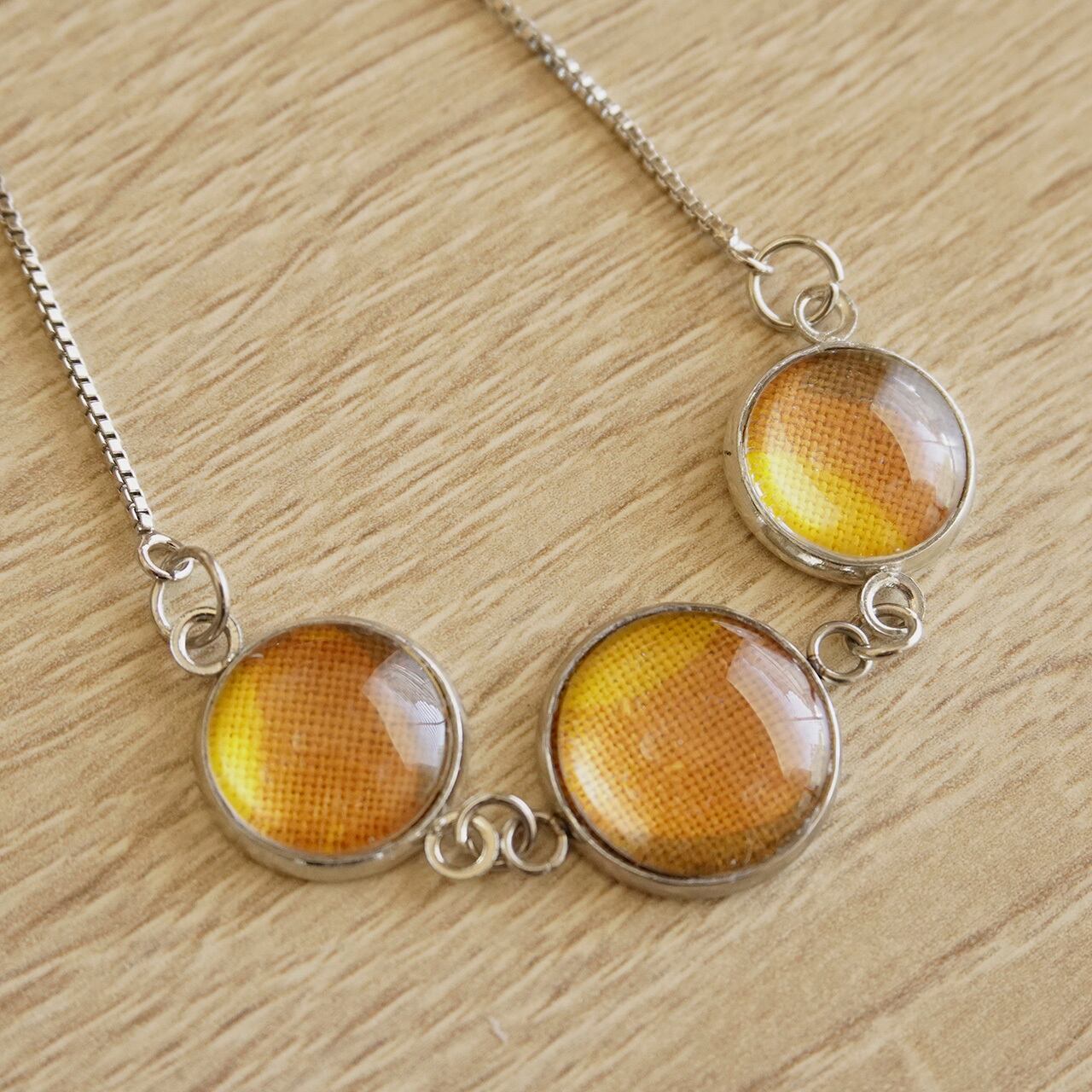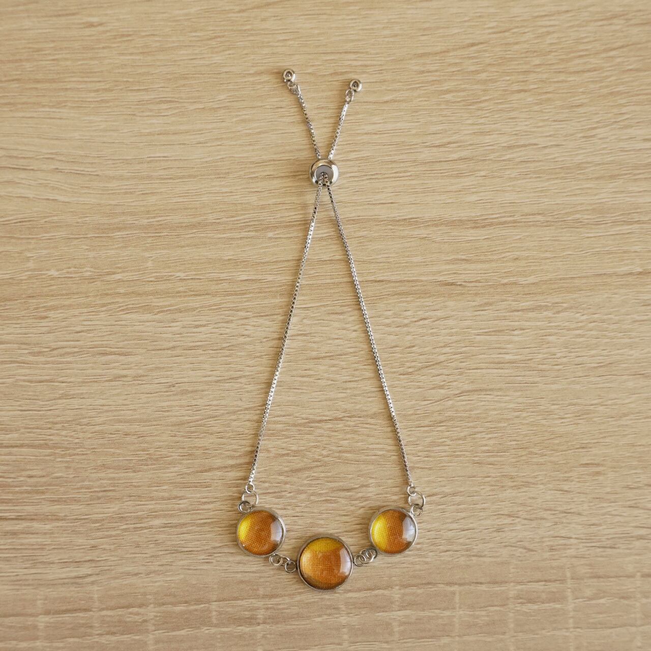 可愛い柄のヴィンテージファブリックを閉じ込めた、小さな丸いクリアクリスタル。それぞれ違うトリミングのクリスタルが並ぶ3連のブレスレットは、動くたび手首に可愛い小さな粒が揺れて、手元がとても華やかになるアイテムです。