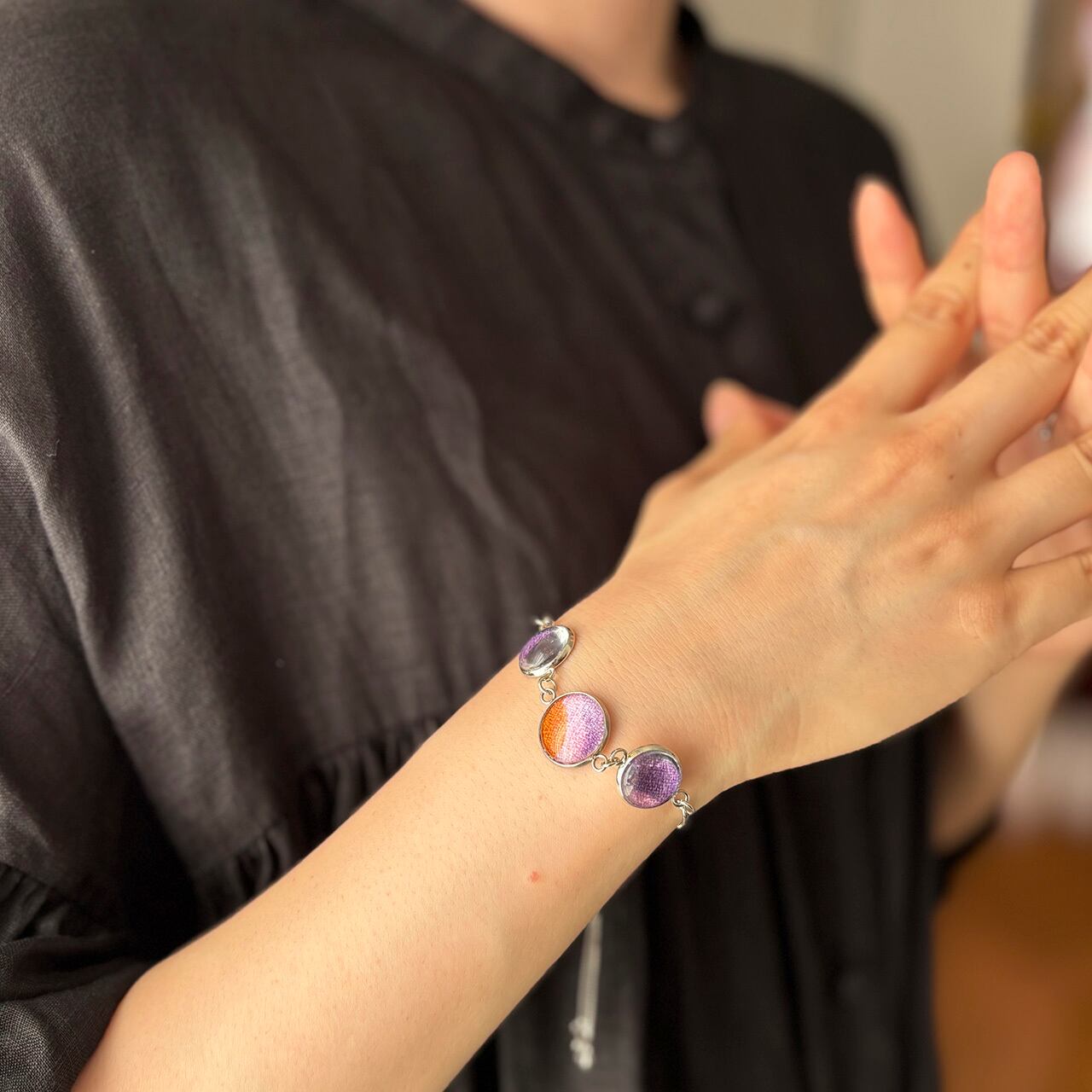 可愛い柄のヴィンテージファブリックを閉じ込めた、小さな丸いクリアクリスタル。それぞれ違うトリミングのクリスタルが並ぶ3連のブレスレットは、動くたび手首に可愛い小さな粒が揺れて、手元がとても華やかになるアイテムです。