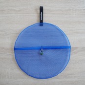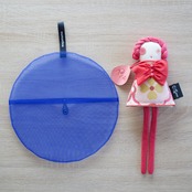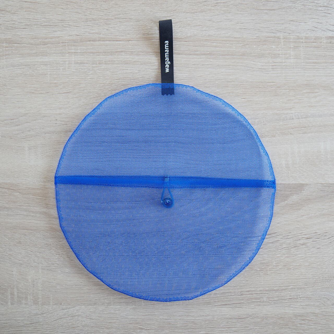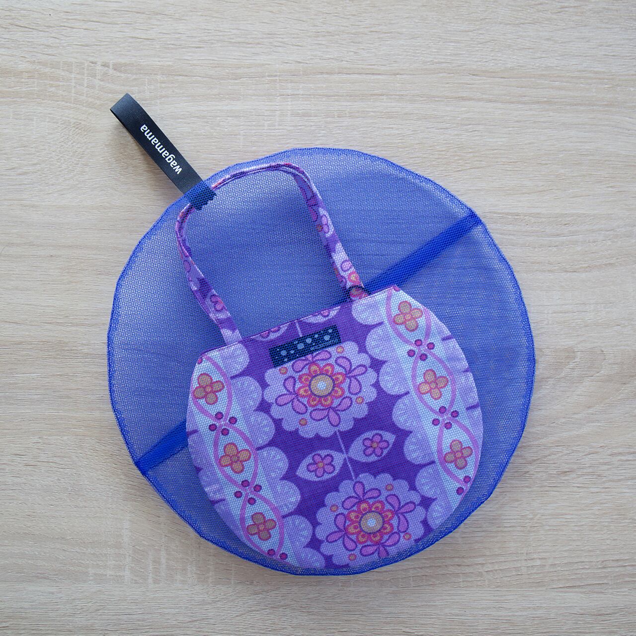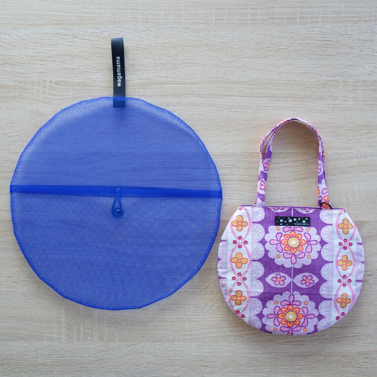 ギフト用に制作したサークルバッグです。蛍光色のメッシュ素材にオリジナルロゴ入りのリボンの持ち手とくるみボタンを付けて制作しました。プレゼントを入れると中が透けて見えます。お部屋に吊るして飾っても可愛いバッグです。