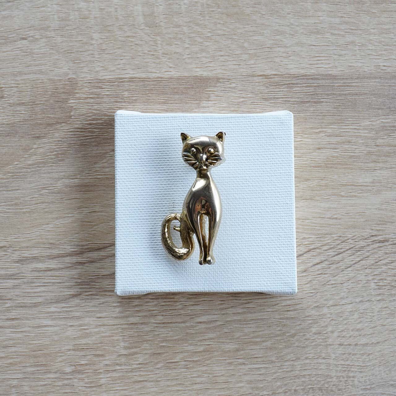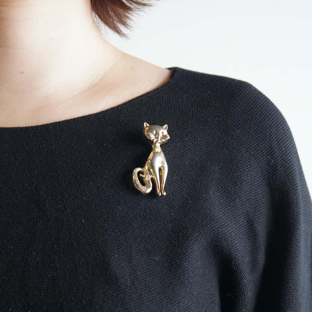 ドイツ製のヴィンテージ猫ブローチ。何かいいたげな表情が面白い。嫌な事があった日でもこれを付けていれば大丈夫。思わずクスッと笑ってしまいそう。丸襟ブラウスの襟元やニット、マフラーやニット帽などの装いにぜひひとつ加えてみてはいかが?