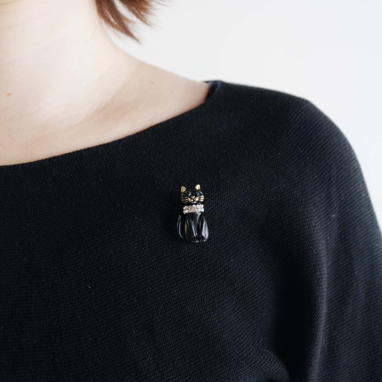日本製ラインストーン黒猫ヴィンテージブローチ。ちょこんと子猫のようなバランスの黒猫ブローチ。大きなブラックラインストーンのおメメとキラキラの首輪がキュート。お出かけの時、丸襟ブラウスの襟元やニット、マフラーやニット帽などにつけて一緒に連れて行ってあげてね。