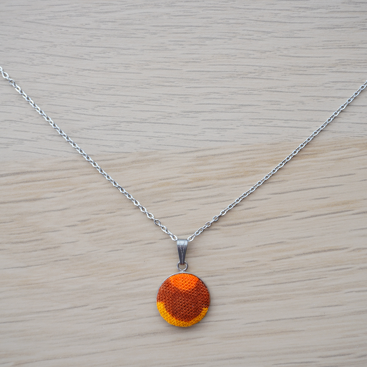 ピンポイントで可愛い部分をトリミングしてまあるいペンダントトップに閉じ込めました。小さいけれどヴィンテージファブリックの魅力がぎゅっと詰まったアクセサリーです。Tシャツやブラウスの胸元に揺れるペンダントは無地ものも華やかな着こなしに。